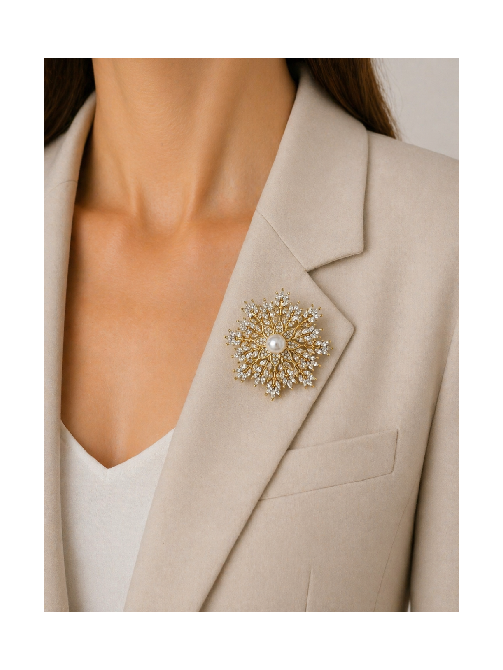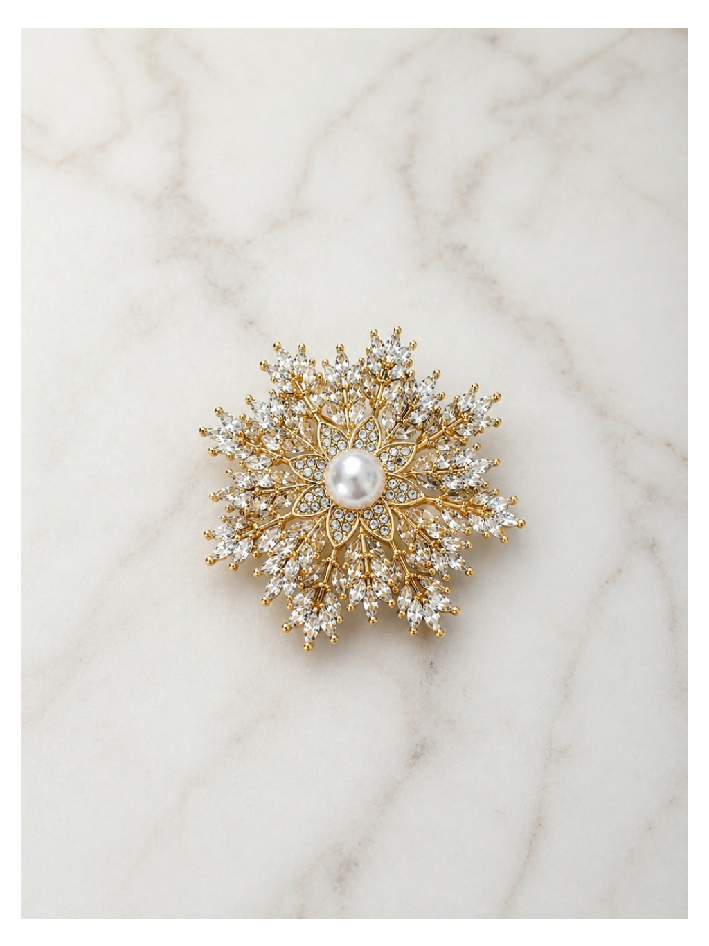 Elegantní dámská brož s perlou a kamínky zaujme bohatě zdobeným motivem připomínajícím květ, hvězdu nebo sněhovou vločku. Kombinace zlatého provedení, čirých broušených kamenů a perly uprostřed působí slavnostně, jemně a velmi luxusně. Tato ozdobná brož na sako, šaty, halenku, kabát i svetr je ideální pro ženy, které chtějí dodat outfitu výrazný, ale stále elegantní detail.