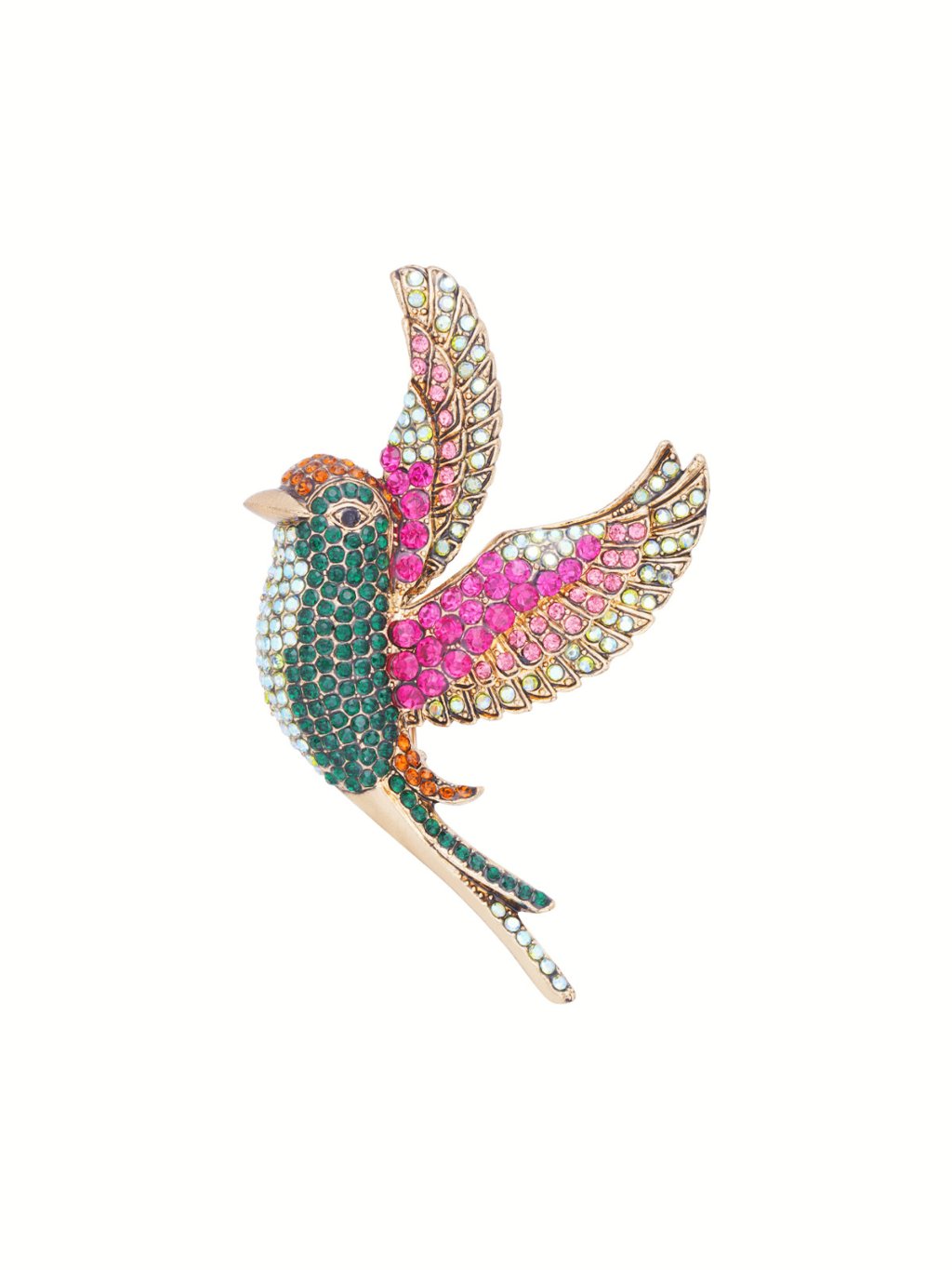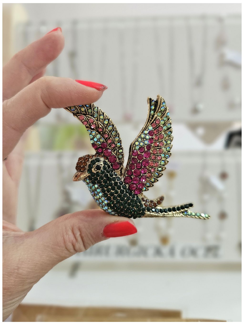 Brož ve tvaru ptáčka zdobená malými zirkony. Ruční práce přidává na originalitě.