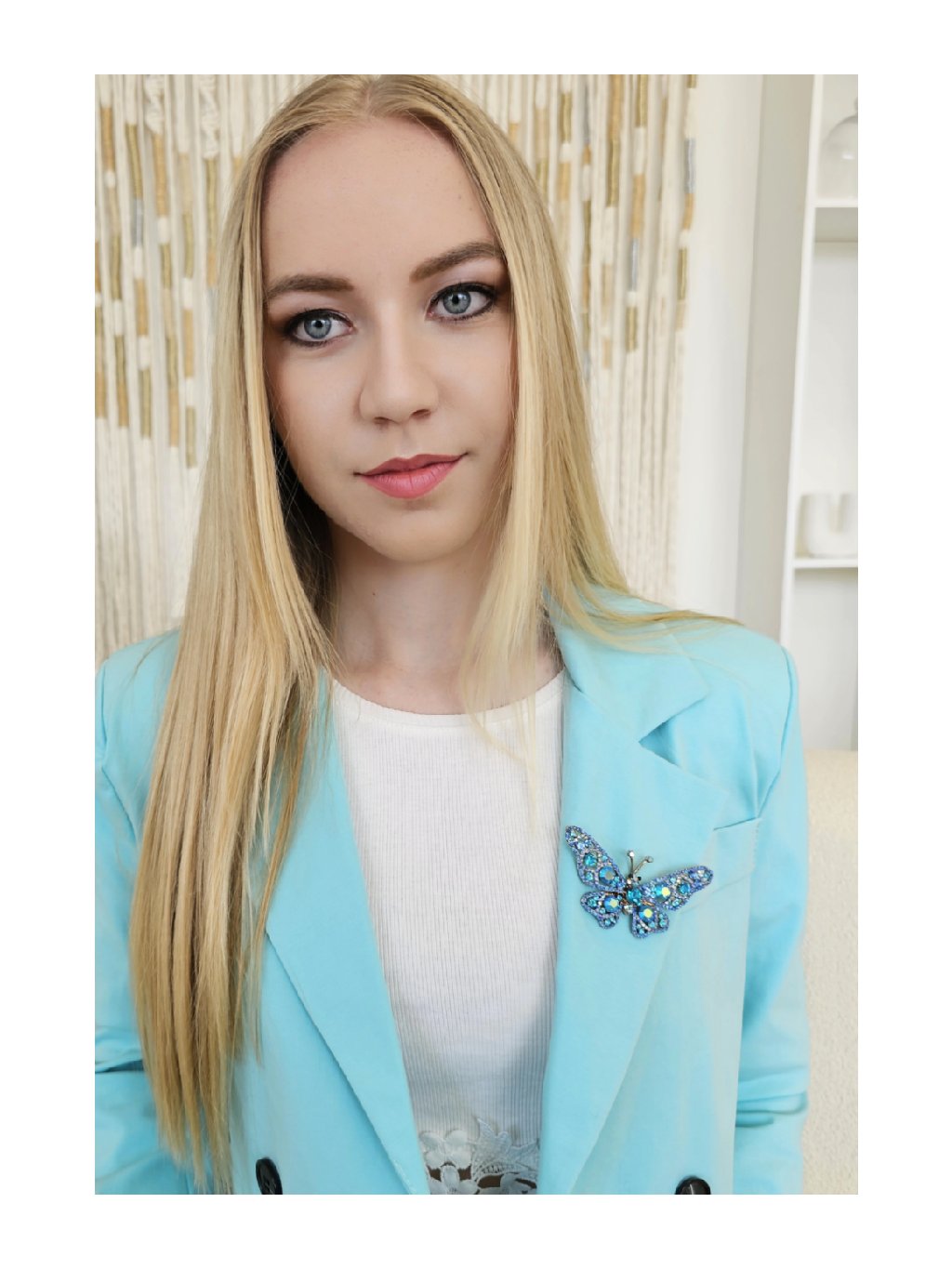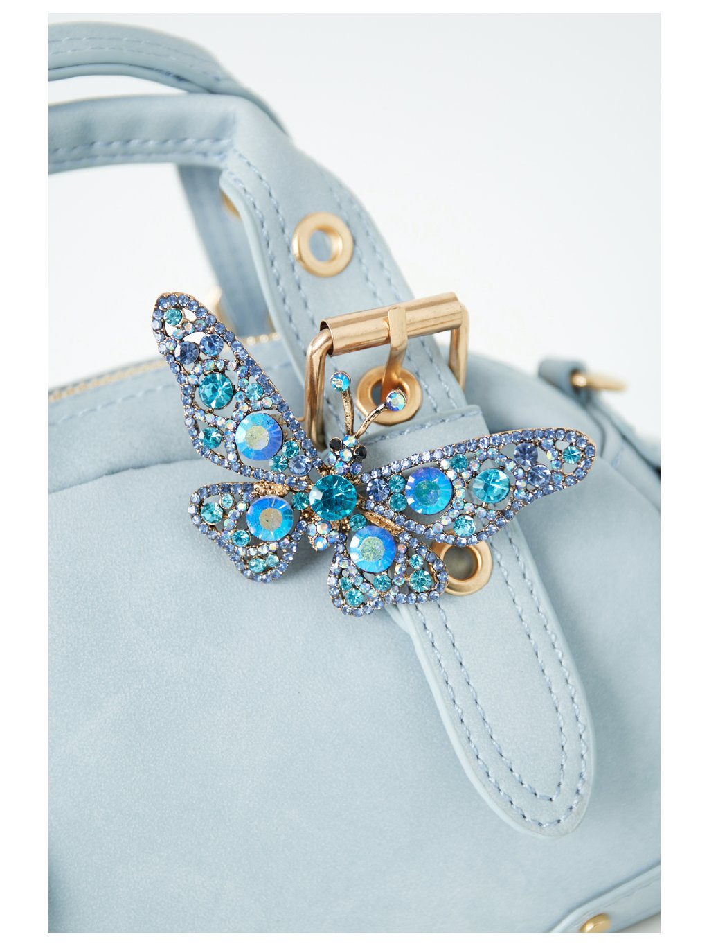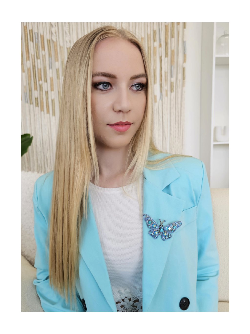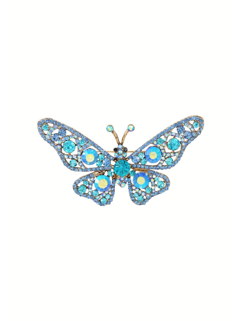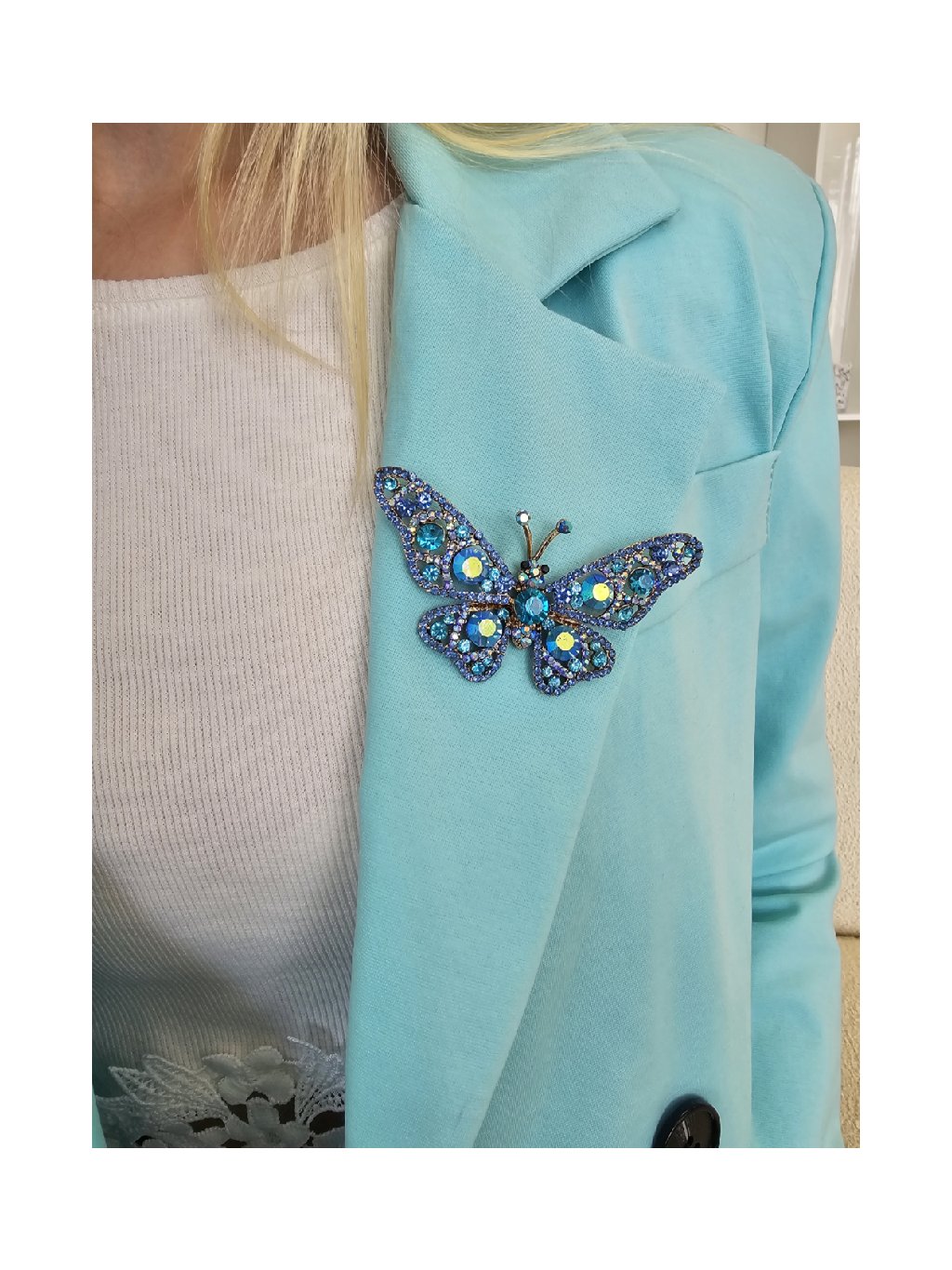 Elegantní brož ve tvaru motýla zaujme na první pohled – je větší, výrazná a bohatě osázená třpytivými kamínky v odstínech modré. Skvělý doplněk pro slavnostní outfit, kabát, šaty nebo sako. Nech svůj styl rozkvést!