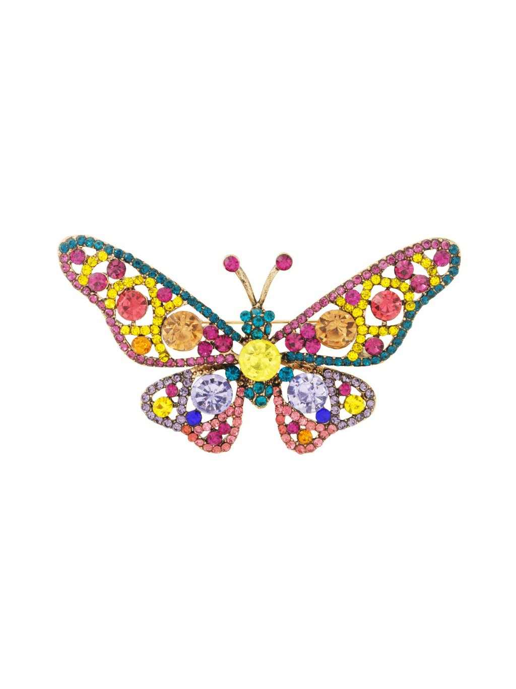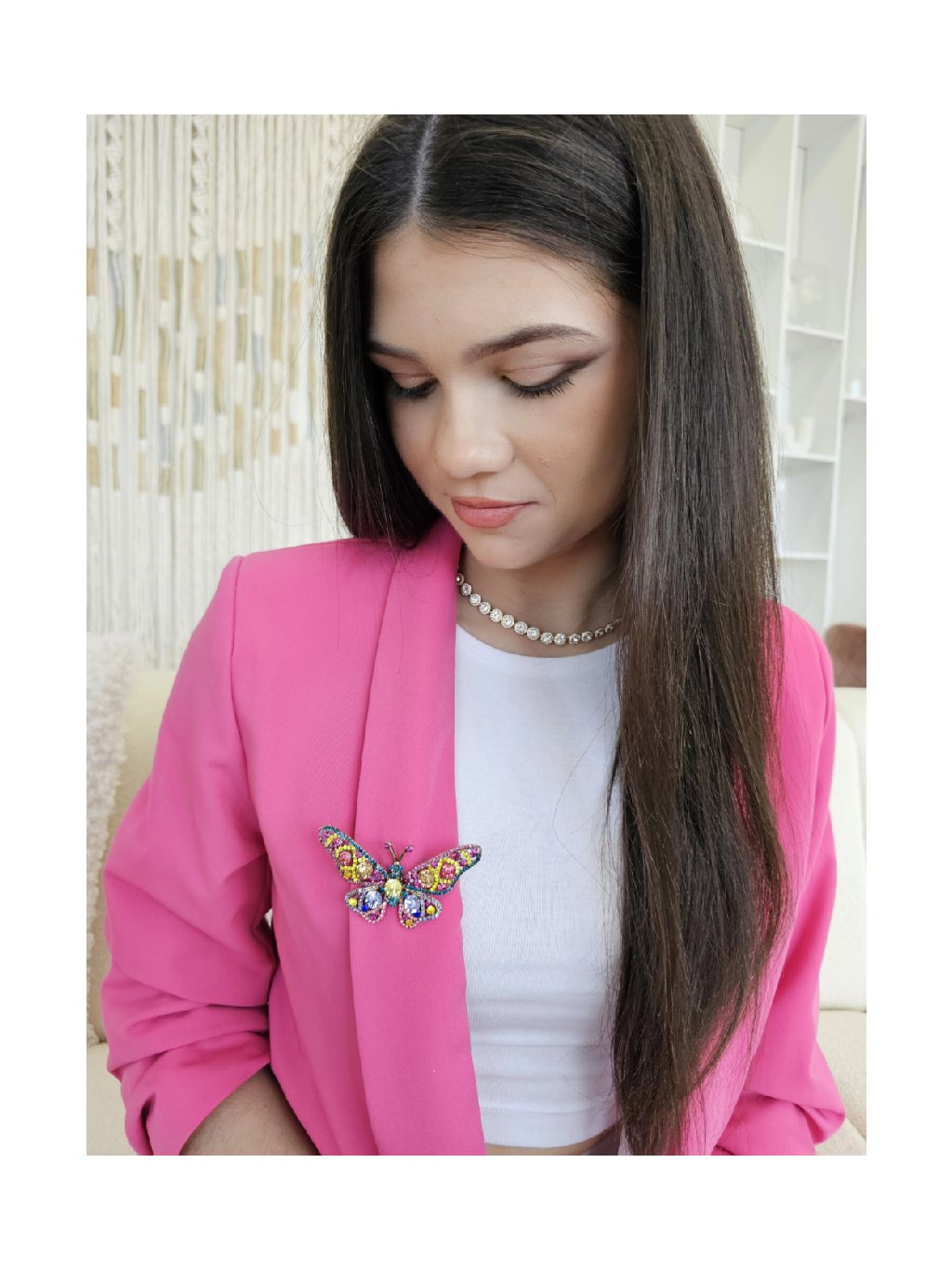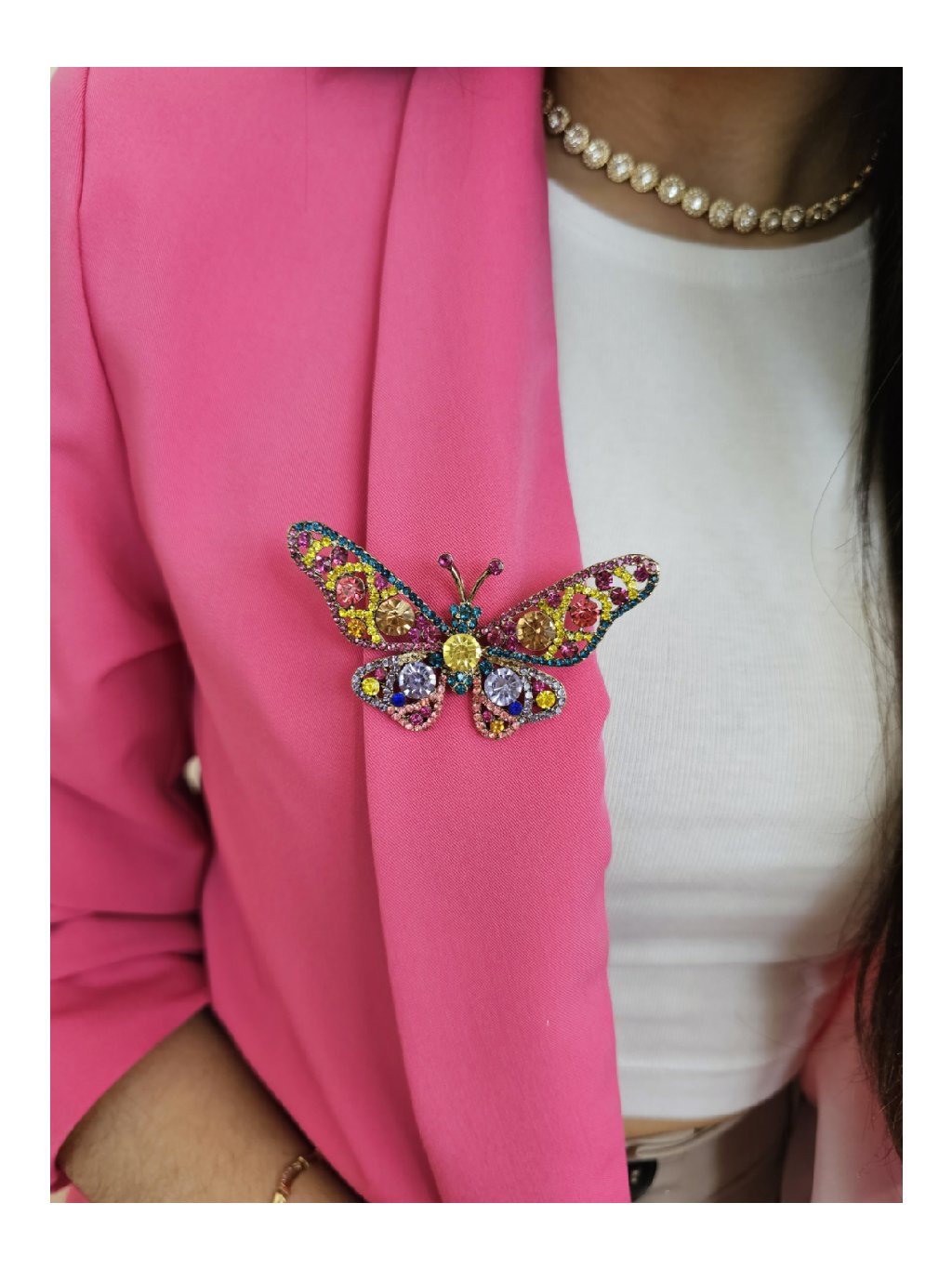 Elegantní brož ve tvaru motýla zaujme na první pohled – je větší, výrazná a bohatě osázená třpytivými kamínky v několika barvách. Skvělý doplněk pro slavnostní outfit, kabát, šaty nebo sako. Nech svůj styl rozkvést!