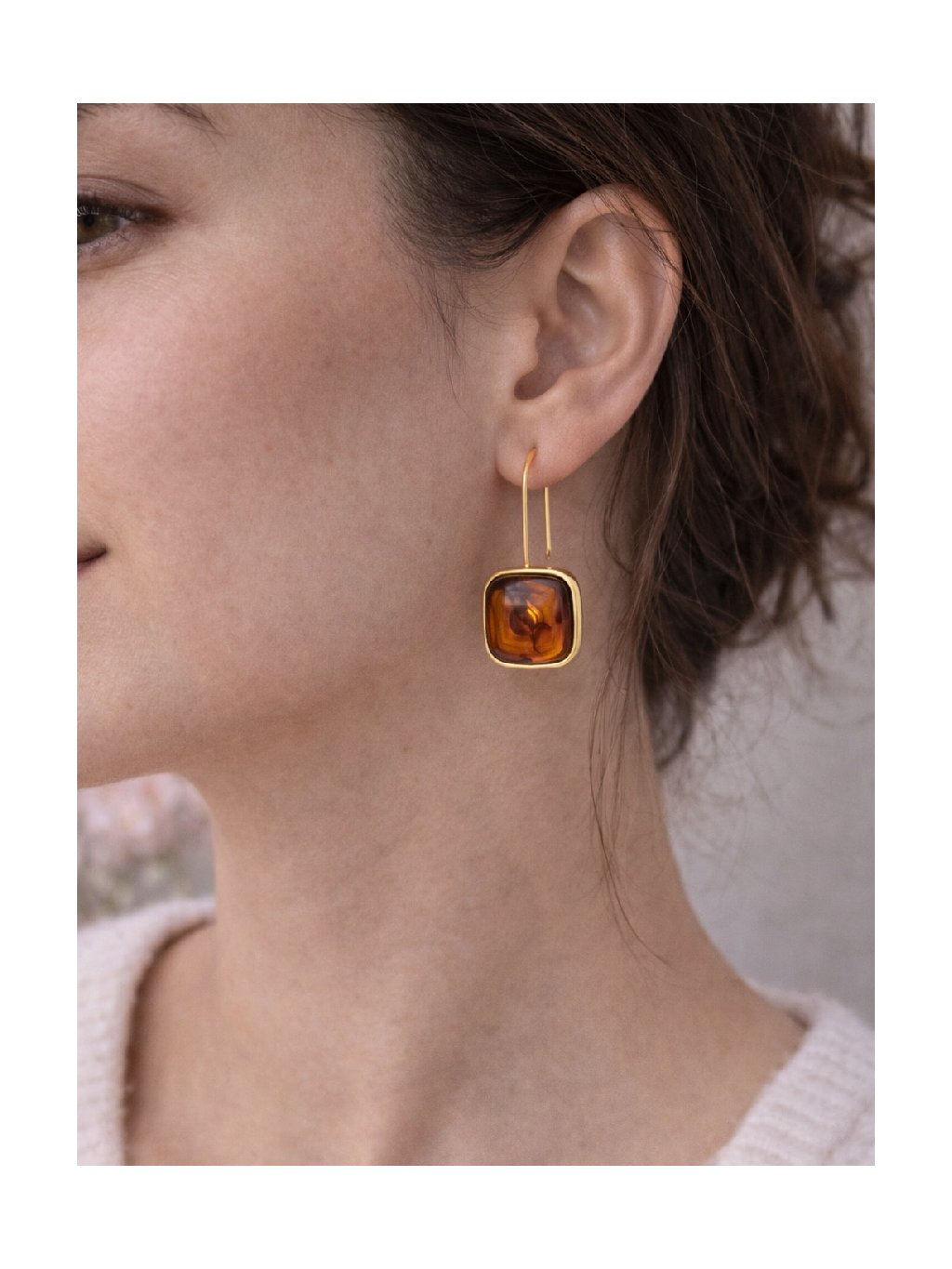Elegantní náušnice se čtvercovým přívěskem z jemné pryskyřice v hnědém odstínu krásně odrážejí světlo a působí velmi čistě a nadčasově. Zlatý rám a háček z nerezové oceli s 18K zlacením dodávají šperku luxusní vzhled, který se hodí jak ke každodenním outfitům, tak i ke slavnostnějším příležitostem. Lehké, pohodlné a přesto nepřehlédnutelné.