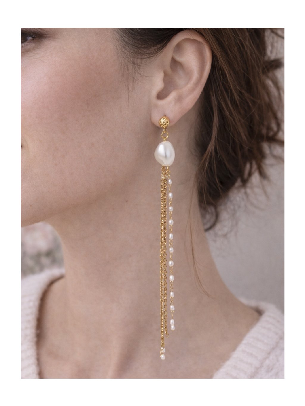 Jemné, ženské a nadčasové. Tyto dlouhé perlové náušnice kombinují elegantní řetízky s decentními perlami, které se při pohybu krásně lesknou a dodávají outfitu lehkost. Horní část zdobí perlička v jemném zlatém uchycení, která působí luxusně, ale stále velmi přirozeně.