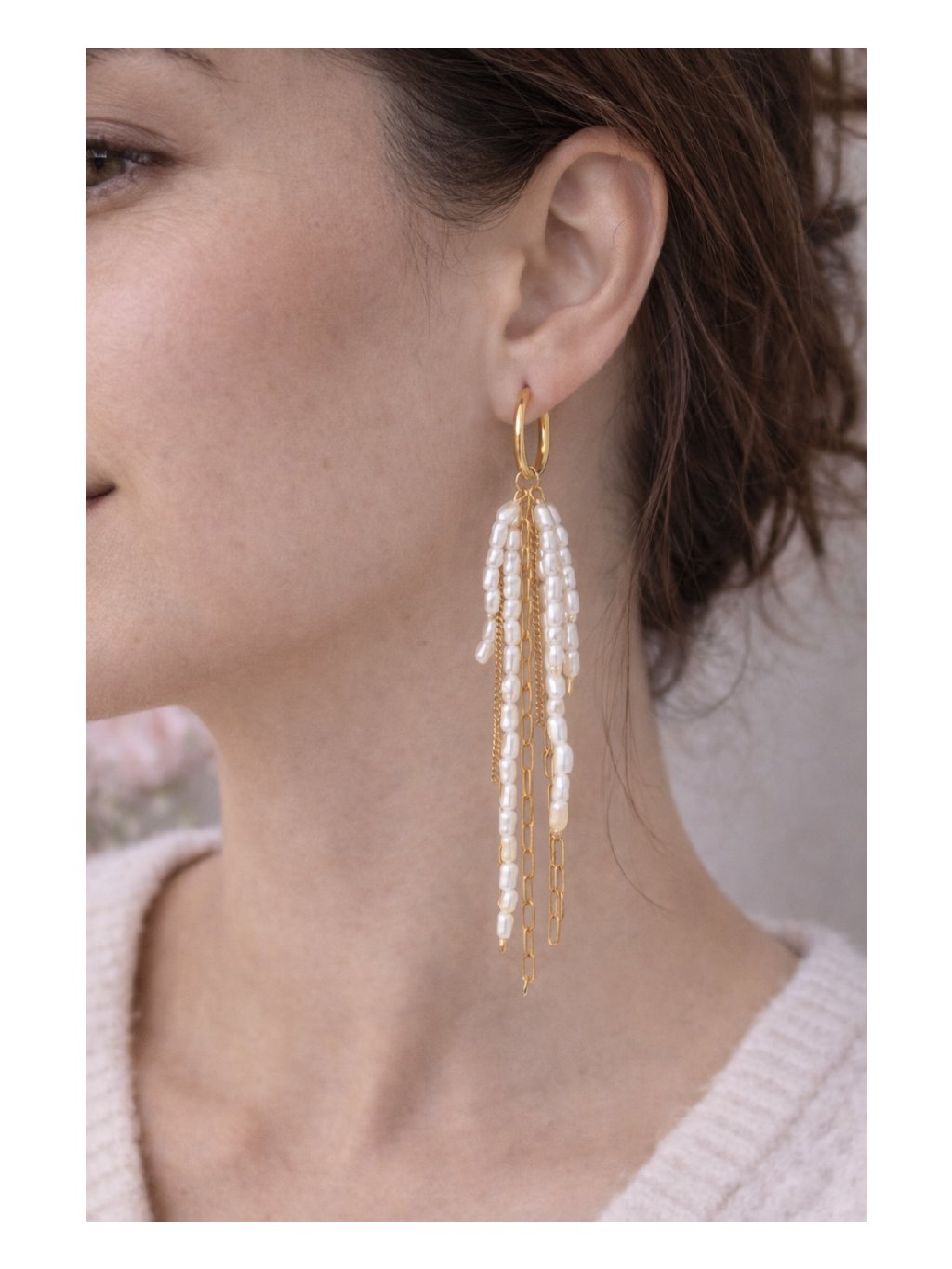 Elegantní dlouhé náušnice s jemnými perlami a zlatými řetízky dodají outfitu lehkost a ženskost. Pohyb perel krásně zvýrazní linii krku a působí velmi jemně, ale přitom výrazně. Ideální volba pro slavnostní příležitosti, ale i jako elegantní doplněk k jednoduchému outfitu.