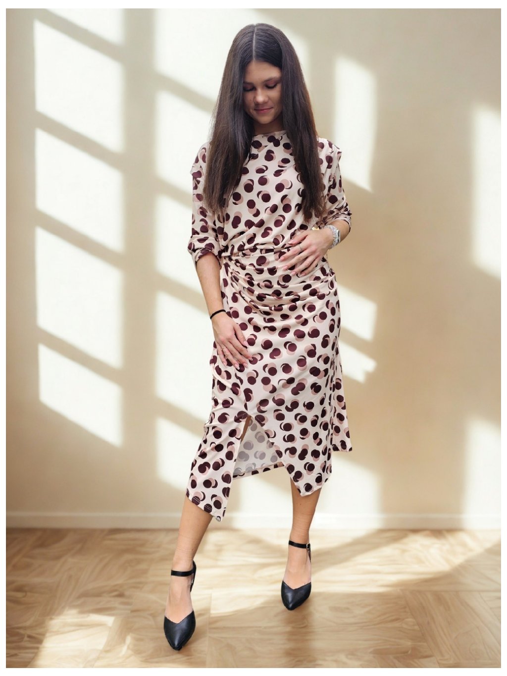 Elegantní vínové šaty s jemným krémovým potiskem upoutají na první pohled svým originálním vzorem i ženským střihem. Mají lehce spadlý rukáv, řasení v pase, které krásně tvaruje siluetu, a rozparek vpředu pro pohodlí i špetku smyslnosti.