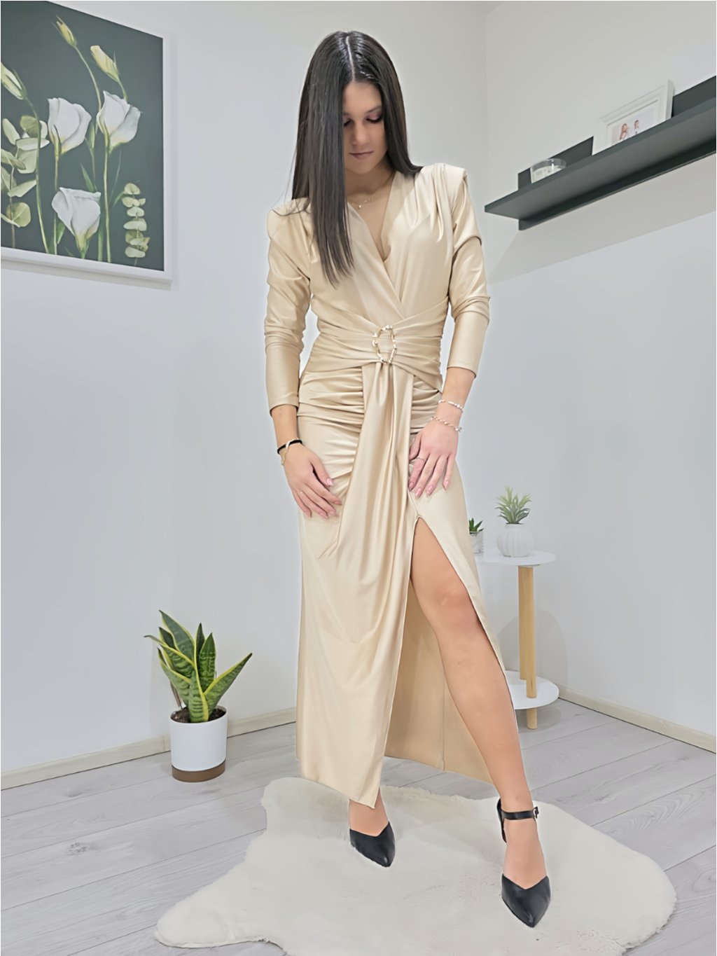 Elegantní béžové šaty z hladkého, pružného materiálu, který se krásně přizpůsobí postavě a zajistí maximální pohodlí při nošení. Šaty mají výstřih do V, efektní řasení v pase a ozdobnou sponu, která zvýrazňuje siluetu a dodává modelu luxusní vzhled.