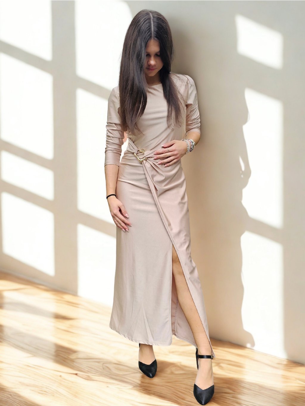 Elegantní béžové šaty JORELY zaujmou svou jednoduchostí i promyšlenými detaily. Dlouhý rukáv, výrazné řasení v pase a ozdobná kovová spona vytvářejí krásnou ženskou siluetu. Rozparek na sukni dodává šatům lehkost a svůdnost.
