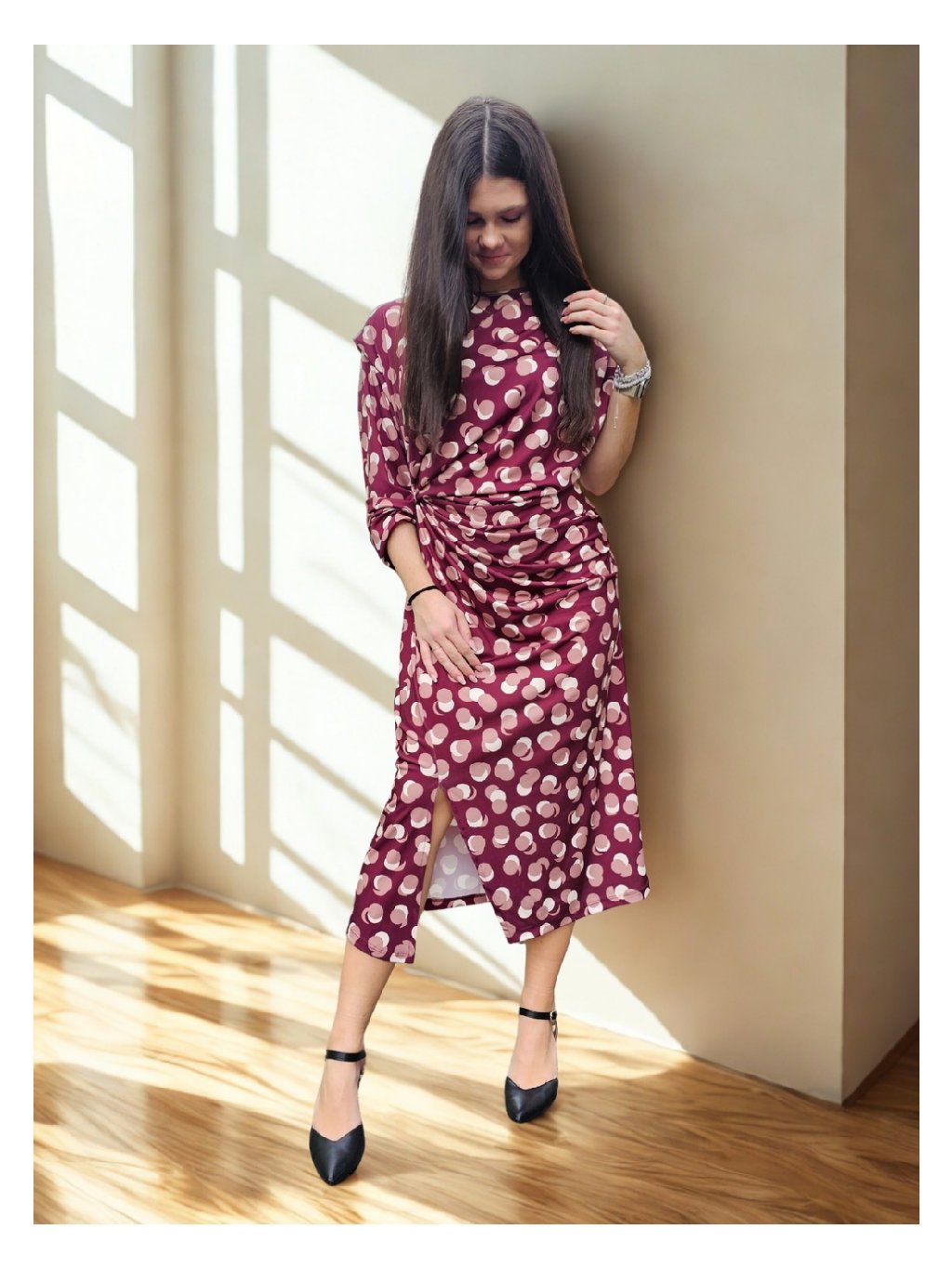 Elegantní vínové šaty s jemným krémovým potiskem upoutají na první pohled svým originálním vzorem i ženským střihem. Mají lehce spadlý rukáv, řasení v pase, které krásně tvaruje siluetu, a rozparek vpředu pro pohodlí i špetku smyslnosti.
