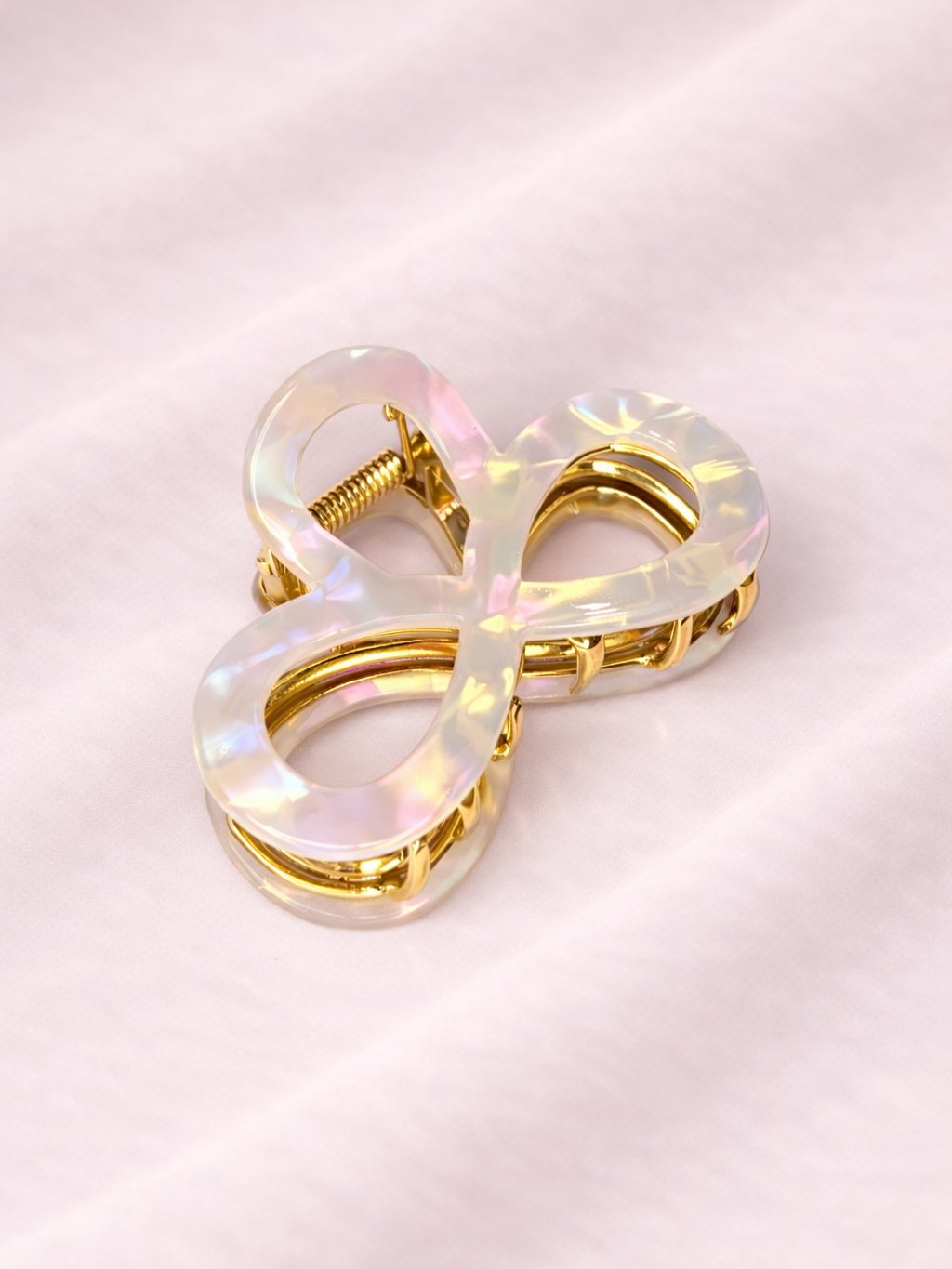 Perleťový skřipec do vlasů ve tvaru nekonečna se zlatými prvky působí jemně a žensky. Díky kvalitnímu zpracování pevně drží účes a dodá vlasům elegantní lesk.