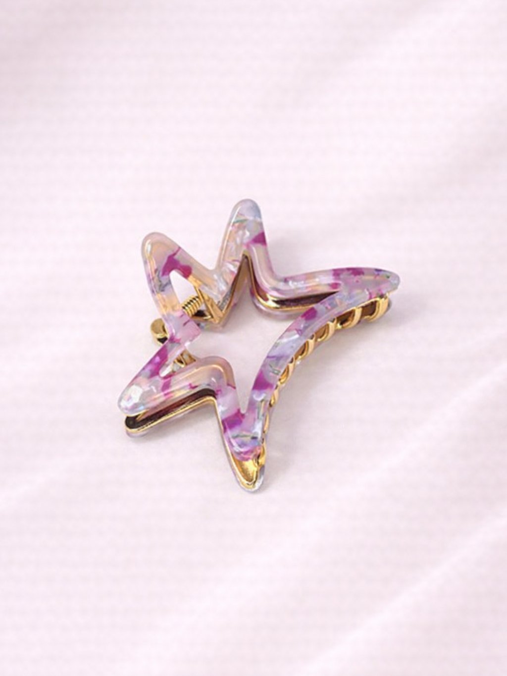 Výrazný skřipec do vlasů ve tvaru hvězdy s barevným melírovým efektem a zlatými prvky. Každý kus je originál díky jedinečné kresbě materiálu. Perfektní volba pro oživení jednoduchého outfitu.