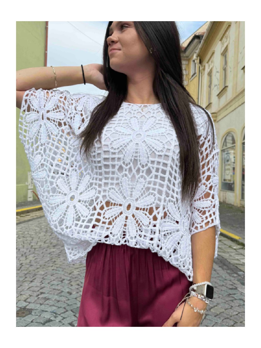 Jemně háčkovaná halenka netopýřího střihu v bílé barvě je ideálním kouskem pro každou ženu. Díky vzdušnému vzoru a univerzální velikosti padne skvěle každé postavě.