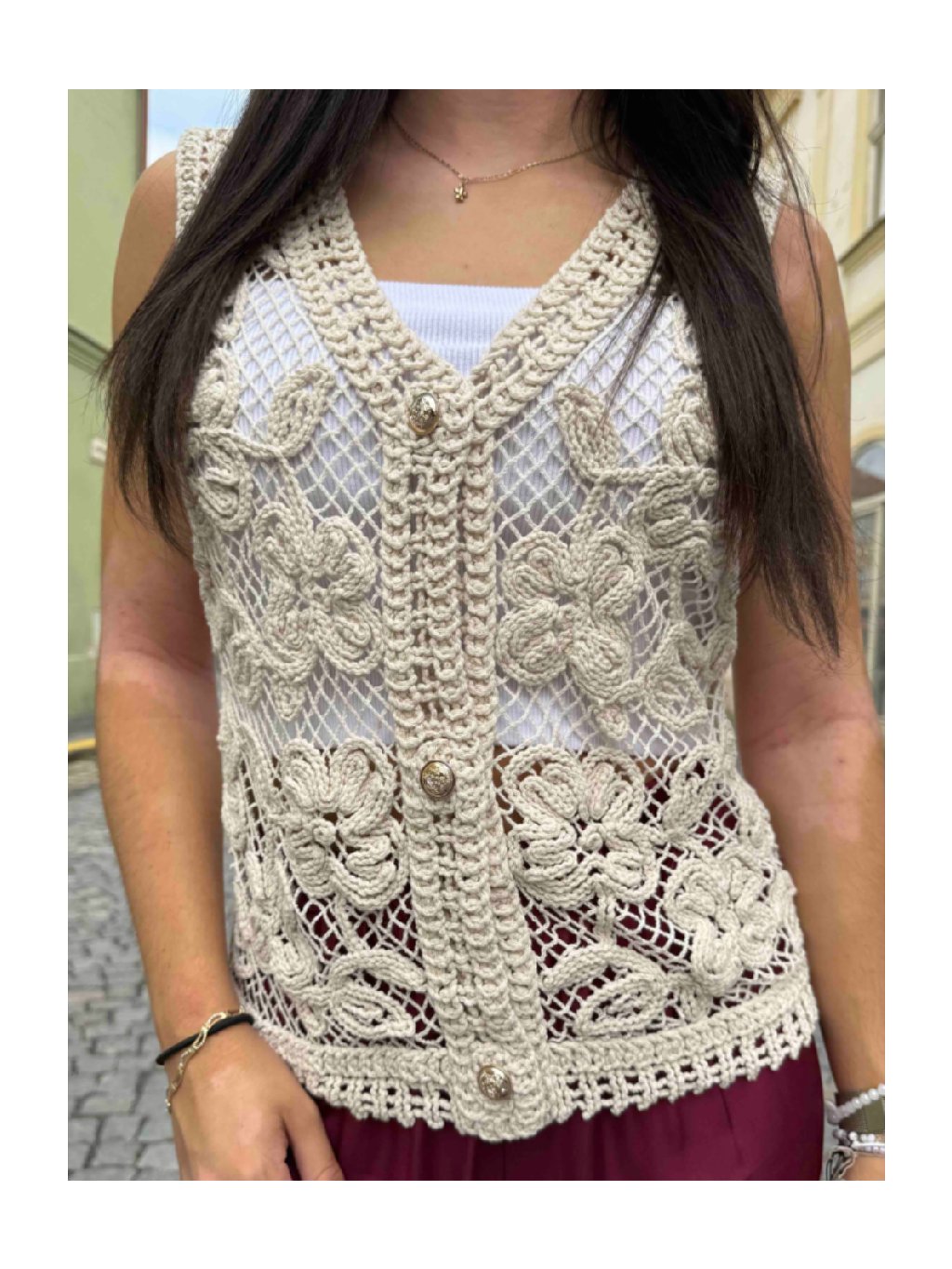 Jemně háčkovaná vestička v béžové barvě je ideálním kouskem pro vrstvení během teplejších dnů i chladnějších večerů. Díky vzdušnému vzoru a univerzální velikosti padne skvěle každé postavě.