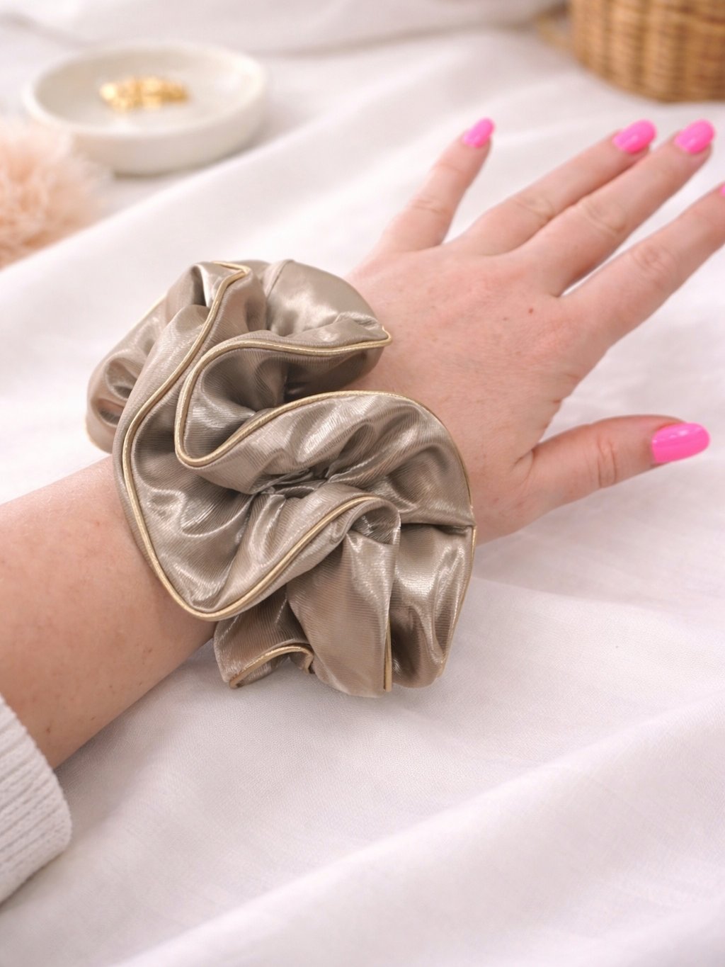 Stylová saténová gumička do vlasů v jemném taupe odstínu je ideální pro ženy, které milují neutrální a snadno kombinovatelné barvy. Hladký saténový materiál je šetrný k vlasům, netahá je a pomáhá chránit jejich strukturu.